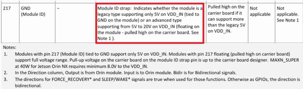我们目前在设计可以兼容Jetson orin nano还有Jetson orin NX的底座,但在看设计手册的时候观察到217 Module ID这个引脚的一些注释。想咨询一下什么情况下VDD_IN需要高于5V呢?正常设计底座时Module ID以及VDD_IN应该怎么给呢?