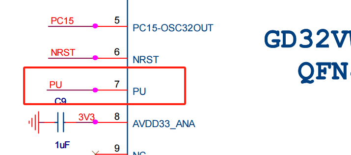 在GD32VW553-IOT-V2的原理图中,MCU的 7号引脚是PU,但是没有查到这个PU的作用,是Pull-UP的意思?可以理解成使能引脚吗?