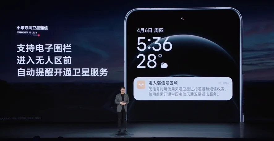 依托双向卫星通信技术,小米14 Ultra确保在诸如大山、无人区、荒漠、岛屿等信号微弱或无网络覆盖的环境下,用户仍可实现双向语音通话、短信发送以及位置信息共享,从而满足与外界实时联络的需求,并在紧急情况下快速获得救援服务。此外,该设备人性化设计了电子围栏功能,会在用户进入此类区域前提醒开通卫星服务。