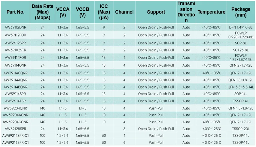 近年来,为满足各种应用场景,艾为针对电平转换系列芯片持续开发出不同的封装类别:DFN、FOWALP、SOT、SOP等以满足手机、IoT、工业、汽车等各行各业���需求。