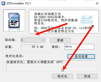 下载并打开SDFormatter软件, 格式化需要烧写镜像的TF卡: SDFormatter