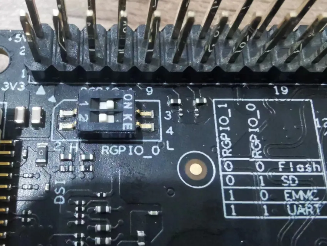 把烧录好镜像的TF卡放入VisionFive2开发板上, 按下图所示将板子上的两个拨码开关拨到对应的位置(上右下左)