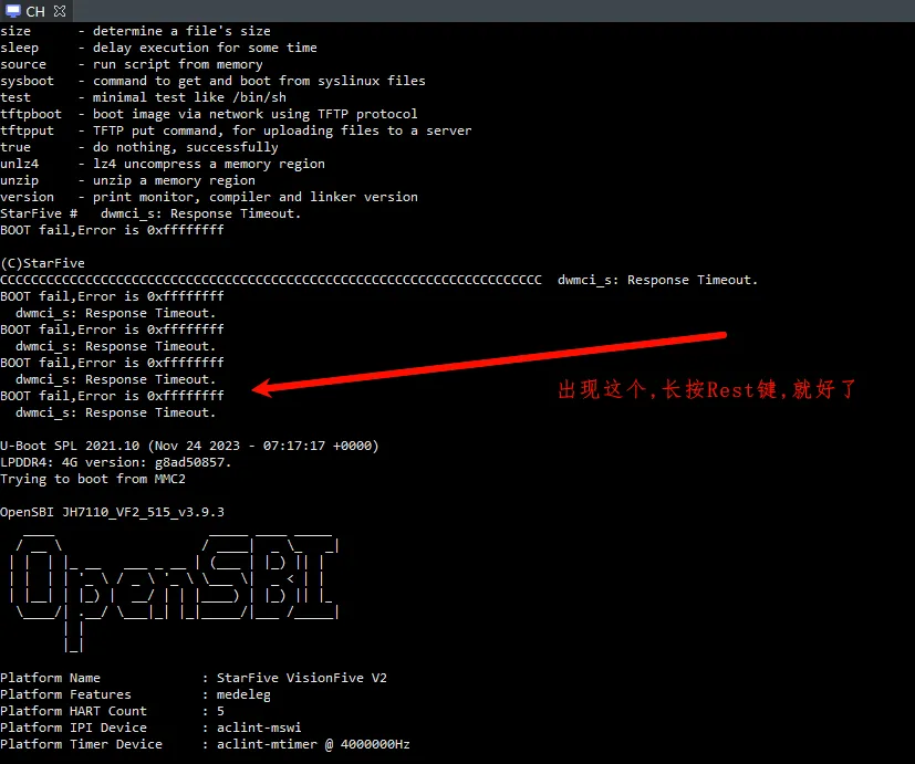 如果串口助手中显示如下内容, 只需要长按Rest按键即可进入系统。