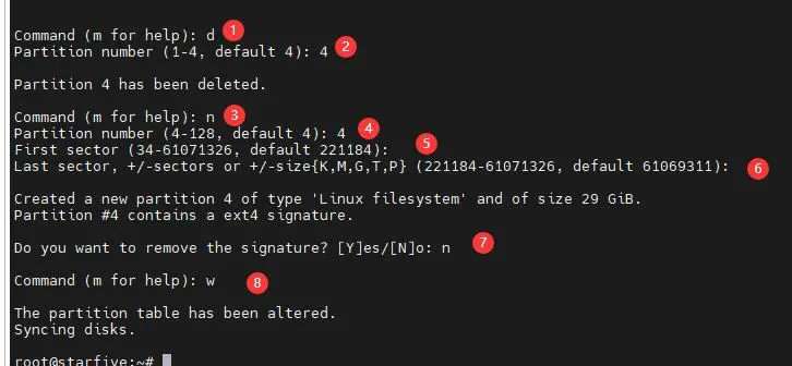 fdisk /dev/mmcblk1按照图示内容输入,5、6号位置直接回车即可