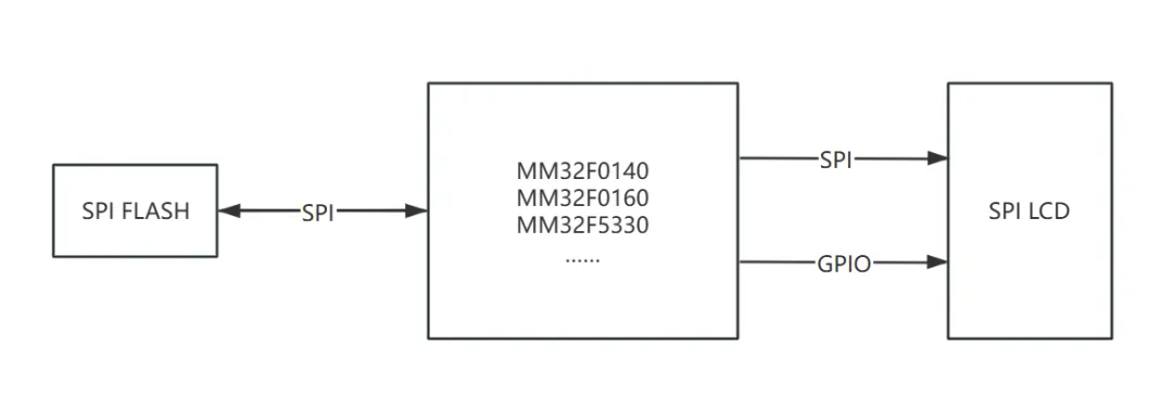 LCD显示应用开发一直以来都是方案开发公司的难点项目,在开发过程中的图片转码、压缩、布局和存储等开发过程都需要花费大量的时间成本,同时个性化的创意显示方案和炫酷的显示效果对硬件的要求越来越高,屏幕刷新速率和硬件成本之间难以平衡。灵动微电子推出的SPI LCD显示参考方案,通过SPI接口读取外部SPI FLASH存储芯片中存储的字体、图片等数据资源,再通过另外一路SPI驱动SPI LCD彩屏显示。对于不同尺寸、不同分辨率的 SPI LCD 彩屏,客户可以选择灵动微电子不同规格的MCU来实现刷屏效果,硬件设计框图如下所示: