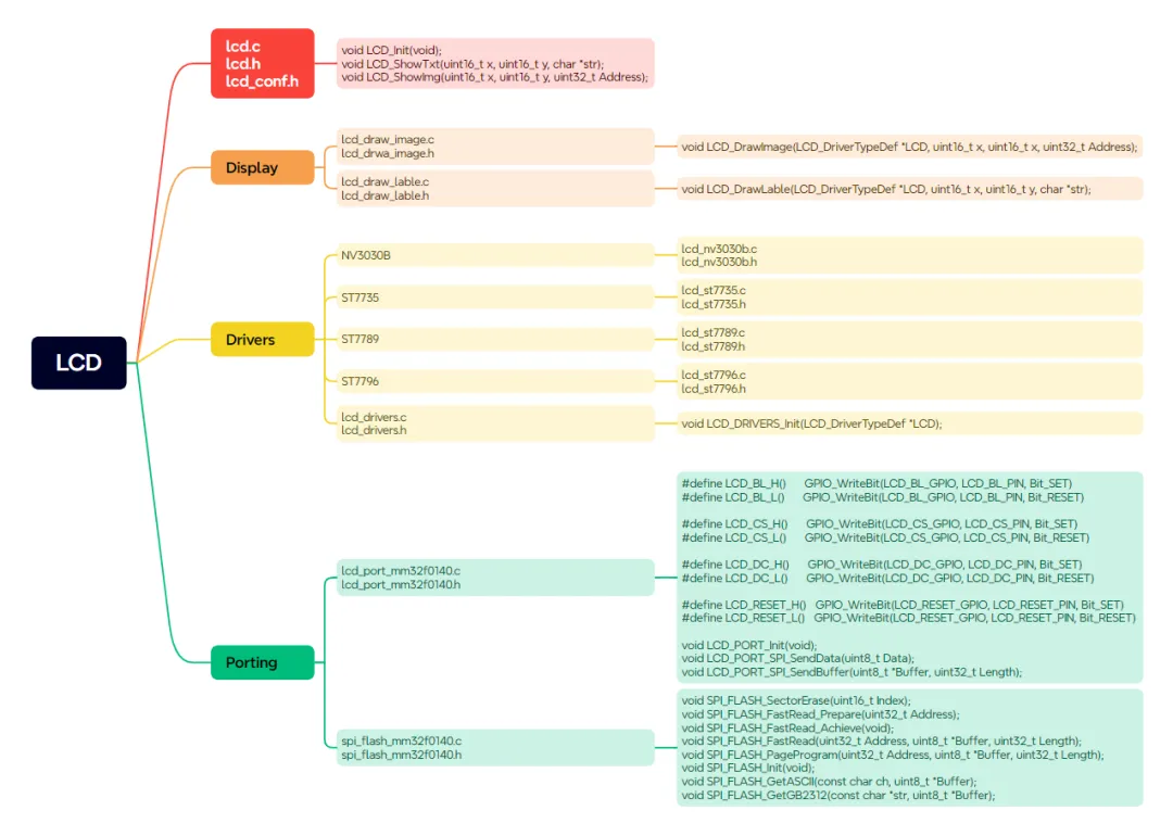 SPI LCD彩屏参考方案的软件部分包含了SPI FLASH驱动及读写操作、SPI LCD彩屏驱动及显示,GUI API函数等。通过驱动分层架构设计,方便客户移植,能够快速添加LCD软件部分到实际项目代码中。