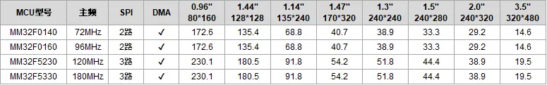 灵动微电子推出的部分系列SPI LCD彩屏参考方案,使用MM32 MCU特殊的SPI控制技术,结合软件处理算法,能够实现高效的刷屏技术,MCU资源和彩屏全屏刷新性能如下表所示:
