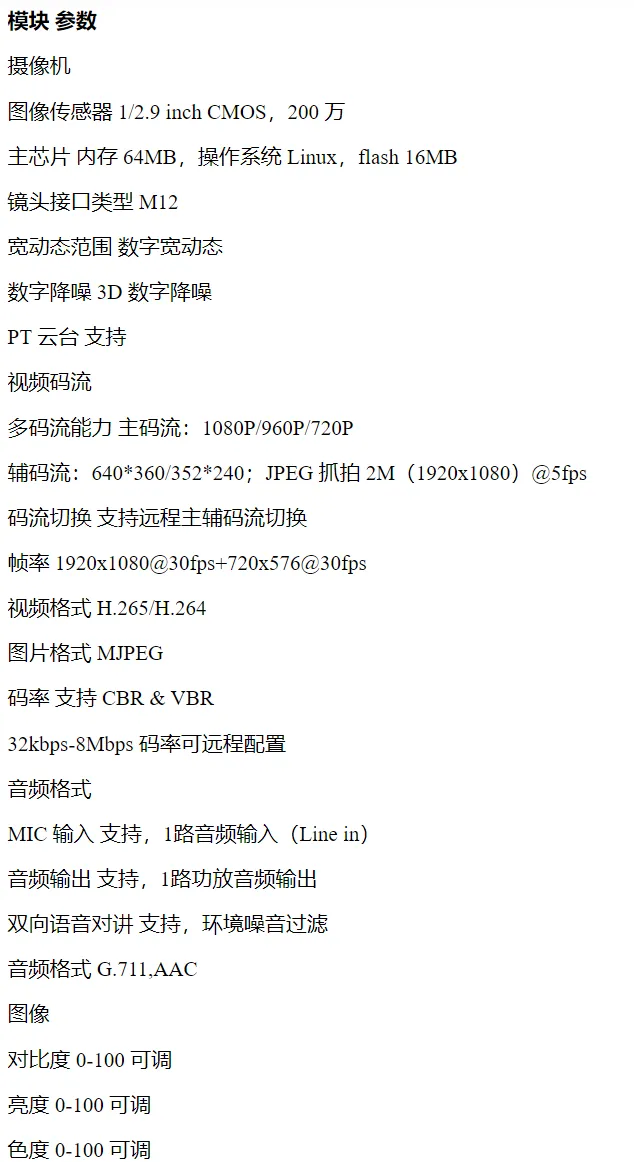 单看这些信息可以知道这是一款面向安防监控方向的监控摄像头模组,有网络接口就可以实现联网监控,也可以通过本地录像机留存