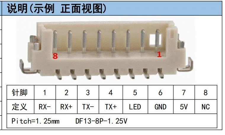 大家要是有RJ45母座的话,画个板子引出引脚用1.25的端子线连接就行,没有的话买一个监控尾线改下线序,记得让商家送个和上面母座匹配的端子