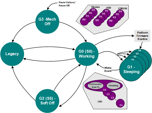 ACPI 定义了多种电源状态,用于管理系统的功耗和性能。