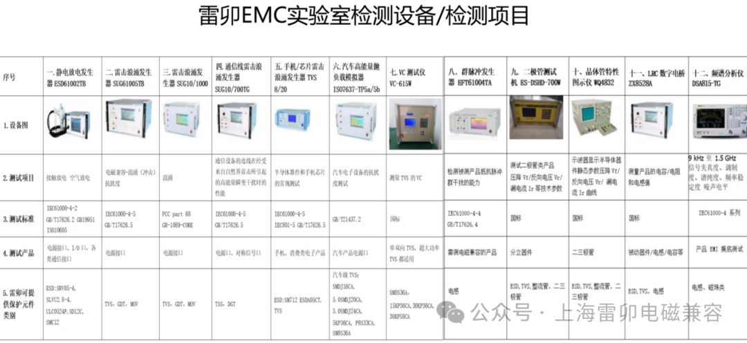 为客户测试静电ESD(30KV)、群脉冲EFT(4KV)、浪涌(8/20,10/700 10/1000)、汽车抛负载(7637 5a/5b)和元器件的性能测试等(参考下表)