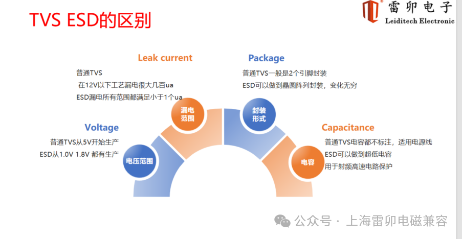 TVS vs ESD:普通TVS漏电流较大(数百μA),适用于电源线;而ESD漏电流小于1μA,且支持超低电容封装,是高速接口保护的理想选择。