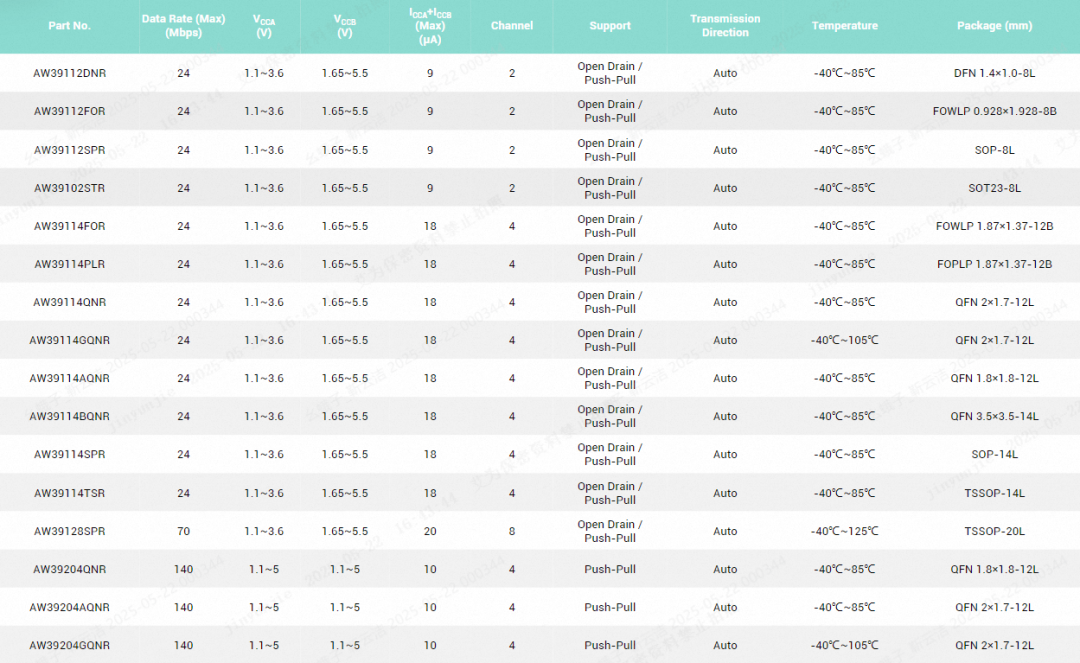 艾为在信号链产品线深耕多年,其中电平转换芯片布局已久,该系列产品丰富多样,涵盖2通道、4通道、6通道、8通道等多种规格。在性能方面,其Data Rate最高可达500Mbps,信号转换电平范围支持0.8V - 5.5V,还具备双向自动方向识别,方向可控功能,同时支持开漏open drain和推挽Push Pull 信号转换,能满足多种场景的信号转换需求。