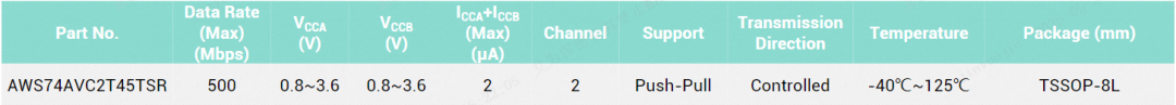 内部集成one shot模块,能够提升传输速率至百Mbps以上,得益于这一点,其非常适合摄像头模组的MCLK,RESET,SYNC信号从1.2V转1.8V的应用,也适合于主平台下发的I2S指令给到数字PA的1.2V转1.8V的应用,以及通用的SPI,PWM信号的应用,并有丰富的量产经验。