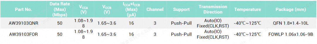 · AW39103FOR: SIM卡电平转换,支持1.2V IO,带EMI滤波器和ESD防护,CSP-9B封装0.35mmpitch