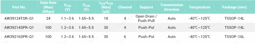 艾为提供适用于I²C电平转换的系列芯片,包含双通道、四通道、八通道规格,支持开漏和推挽设备接入,支持双向信号传输,且满足VCCA≤VCCB的电平适配条件。