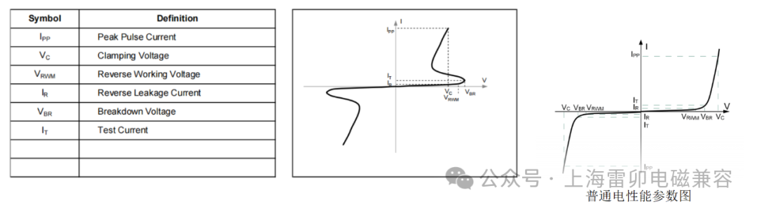 · VBR:击穿电压,ESD防护开始工作的电压,通常是TVS通过1 mA时的电压。