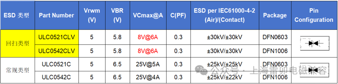 上海雷卯推出两款5V,小封装(DFN1006和DFN0603),带回扫,低钳位电压VCmax的防静电二极管:ULC0521CLV、ULC0542CLV。