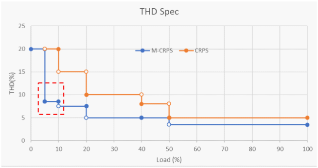 随着服务器计算需求的增长,特别是云计算和人工智能(AI)计算的兴起,服务器CPU/GPU所需功率在大幅增加,服务器电源的功率预算已经从21世纪初的200W至300W范围,增加到现在的800W至2000W,并且未来可能进一步增加到3000W/5500W甚至8000W以上。为了满足电子产品对高质量电源的需求,同时,在行业头部企业和节能减排宏观趋势的驱动下,服务器电源的行业标准也将从当前国内普遍采用的CRPS2.2标准逐渐升级到M-CRPS标准,新标准对掉电再恢复的冲击电流、电网电流THD、PF值及功率密度等方面提出了更为严格的要求,THD新旧标准差异如图1所示。