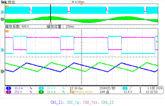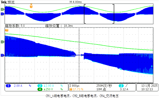 未开启消隐延迟功能时,由于工频过零点附近TON开启未能使负电流恢复到给定值以上,样机工作异常,频繁的进入负向OCP的过流保护,不能正常起机,如图10所示。当开启消隐延迟功能时,如图11所示,样机正常工作,工频过零点附近电流波形平滑无尖刺。