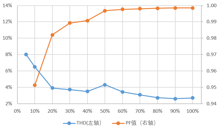 图 6 额定220V输入下THD曲线(左轴)和PF值(右轴)以及不同输入下的效率曲线