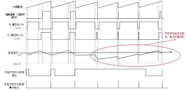 小华HC32F334芯片针对上述问题,对外设细节进行了优化处理,以便应对上述问题。芯片增加了外部事件消隐延迟功能,如图7所示。工频过零点附近,当负电流持续有效时,在死区时间结束后会清零计数器进而重新开启TON,直到负电流恢复到给定值以上。本方案中,负电流检测消隐信号跟随功率管脉冲动态调整,图8为未开启消隐延迟功能的发波示意图,图9为开启消隐延迟功能的发波示意图。