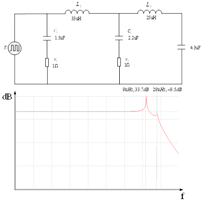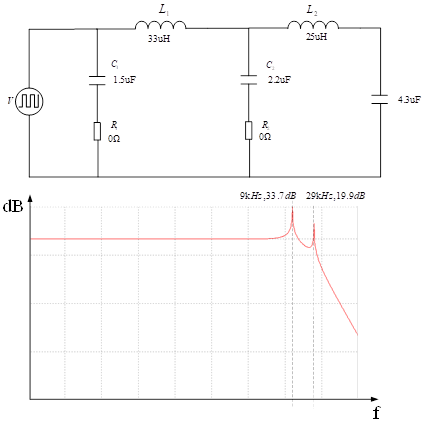 另外,为了提高轻载效率以及THD,方案在40%负载以下工作在单路模式,这对输入滤波器提出了更高的要求。如图14所示,为方案中采用两级滤波器仿真模型图以及滤波器的幅频特性。