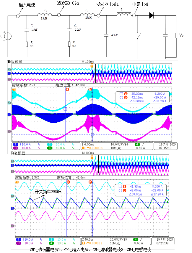 如图14所示,滤波器包含两个谐振频率,本方案中两路工作模式切换至单路工作模式后,工作频率相比两路工作模式下会降低,进而穿越如图14所示的最右侧的谐振频率。由于该谐振频率点的衰减系数突然变小,同时由于是工作在TCM模式下,电感电流波形为三角波,幅值比较大,这样位于谐振点附近的电感电流衰减系数不够,导致三角波电感电流几乎无衰减。在输入滤波器看进去的电流如图15所示,滤波器在谐振频率29KHz处对电感电流几乎无衰减。如果将滤波器的谐振频率降低,必然要增加差模感量或者X电容容值,这样会导致输入滤波器的插入损耗进一步增加或者导致无功电流增加影响PF值。