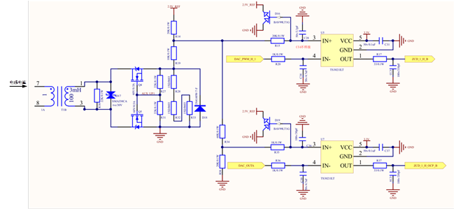 TCM模式下的PFC工作在变频模式,频率范围可由20kHz至300kHz区间变化,因此负电流检测对检测回路的带宽要求较高,参考方案使用高频互感器进行检测,如图17所示。当电流从互感器T1的7引脚流向8引脚,Q4和Q5开通进行正向电流的OCP检测,以及ZCD电流的检测;当互感器不检测电流(关断),Q4和Q5关断,互感器T1由D17进行退磁。与、串联的互感器采样回路分别实现了的OCP采样与的负电流采样,采样波形如图18、19所示。采样波形分别经过高速比较器输出至MCU芯片HRPWM外设,经过HRPWM外设灵活的外部事件处理性能实现逐周期的OCP电流保护功能以及负向电流检测功能。