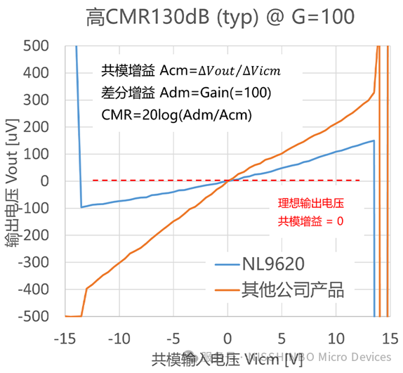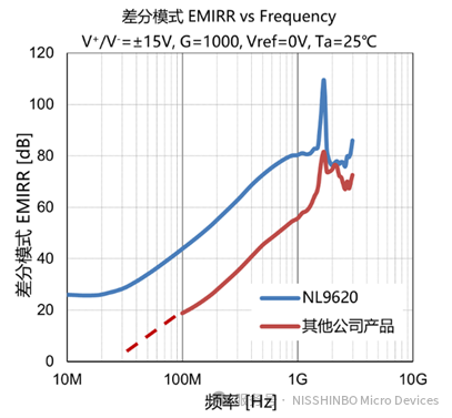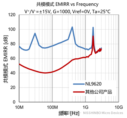 本产品采用高精度修调技术,实现了130dB typ.(110dB min.)@G=100的高共模信号抑制比。下图显示了本产品与其他公司代表性产品的比较。即使共模输入电压波动很大,仪表放大器的输出电压波动也可以降至最小,从而实现高CMRR性能。因此,即使在共模信号噪声较多的环境中也能稳定工作,从而有助于提高客户产品的精度,实现高精度。
