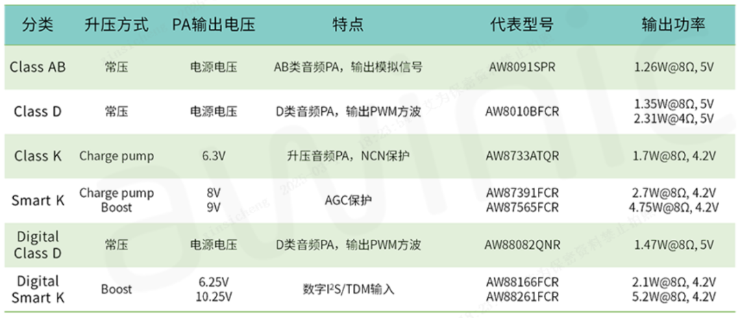 艾为全系列音频功放产品,覆盖模拟/数字接口、1W~5W 输出功率,适配各种应用场景需求。