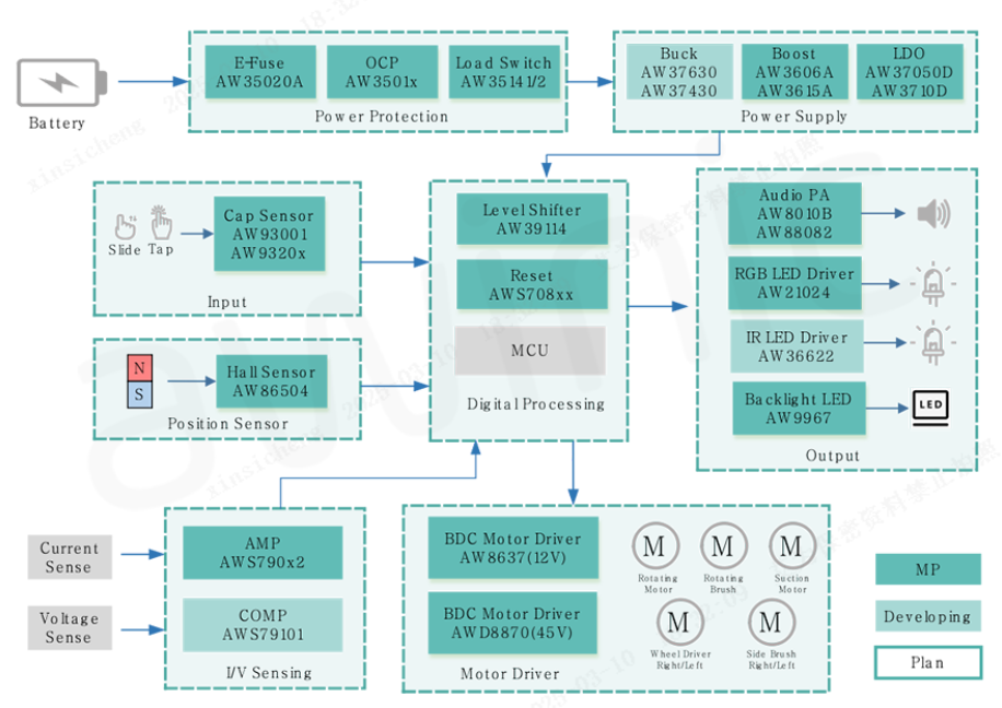 扫地机器人市场的蓬勃发展带来了方案和体验的不断更新,艾为基于人机交互、智能检测、马达驱动和通用器件四大应用场景推出相应的产品组合方案,为品牌和用户提供便捷、可靠的使用体验。