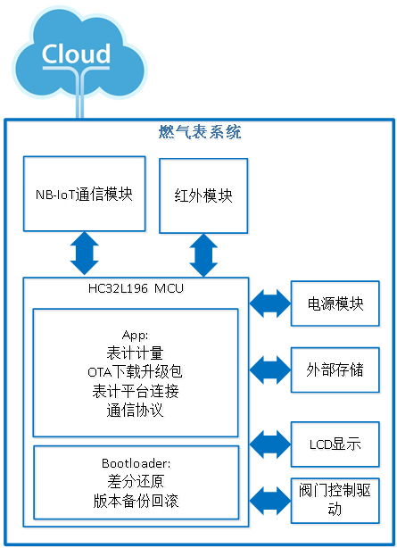 本案例是以小华HC32L196作为主处理器实现的智能燃气表,通过NB-IoT模块实现远程通信和固件升级,燃气表的系统框图如图5所示。因为燃气表的供电方式是电池供电,升级过程要求时间短、传输数据量少、功耗低,因此固件的升级方式采用小华的差分升级方案,数据通过NB-IoT模块透传实现。