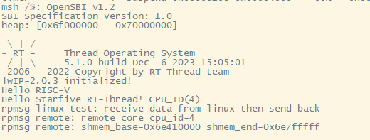 drivers/rpmsg/virtio_rpmsg_starfive.c· RT-Thread:使用开源的rpmsg-lite代码,也是开源的virtio-base的RPMsg代码,能够按照协议和Linux收发数据。核间的IPI中断和共享内存配合能实现异构核间的数据传输。RT-Thread代码路径如下: