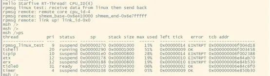 IPI5: 12 0 0 AMP rpmsg interruptsAMP双系统(Linux + RT-Thread)的演示示例现已更新至RVspace文档中心:https://doc.rvspace.org/VisionFive2/Application_Notes/RT-Thread/index.html