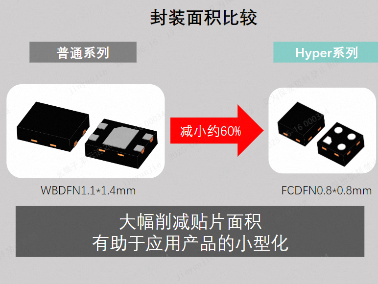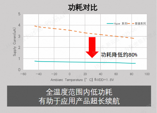 “Hyper-Hall”系列首款家族成员采用小型FCDFN封装尺寸(0.8mm×0.8mm)。与普通的WBDFN封装尺寸(1.1mm×1.4mm)产品相比,产品贴片面积缩小到原来的40%(1.54mm²缩小至0.64mm²),为高密度PCB布局优化更多空间,助力客户实现更紧凑的电路设计和更大的电池空间。此外“Hyper-Hall”系列通过超低功耗架构突破,产品工作功耗低于0.8uA,与传统产品相比功耗降低到原来的20%(4μA降低至0.8μA),实现高效率工作,有助于应用产品超长续航。
