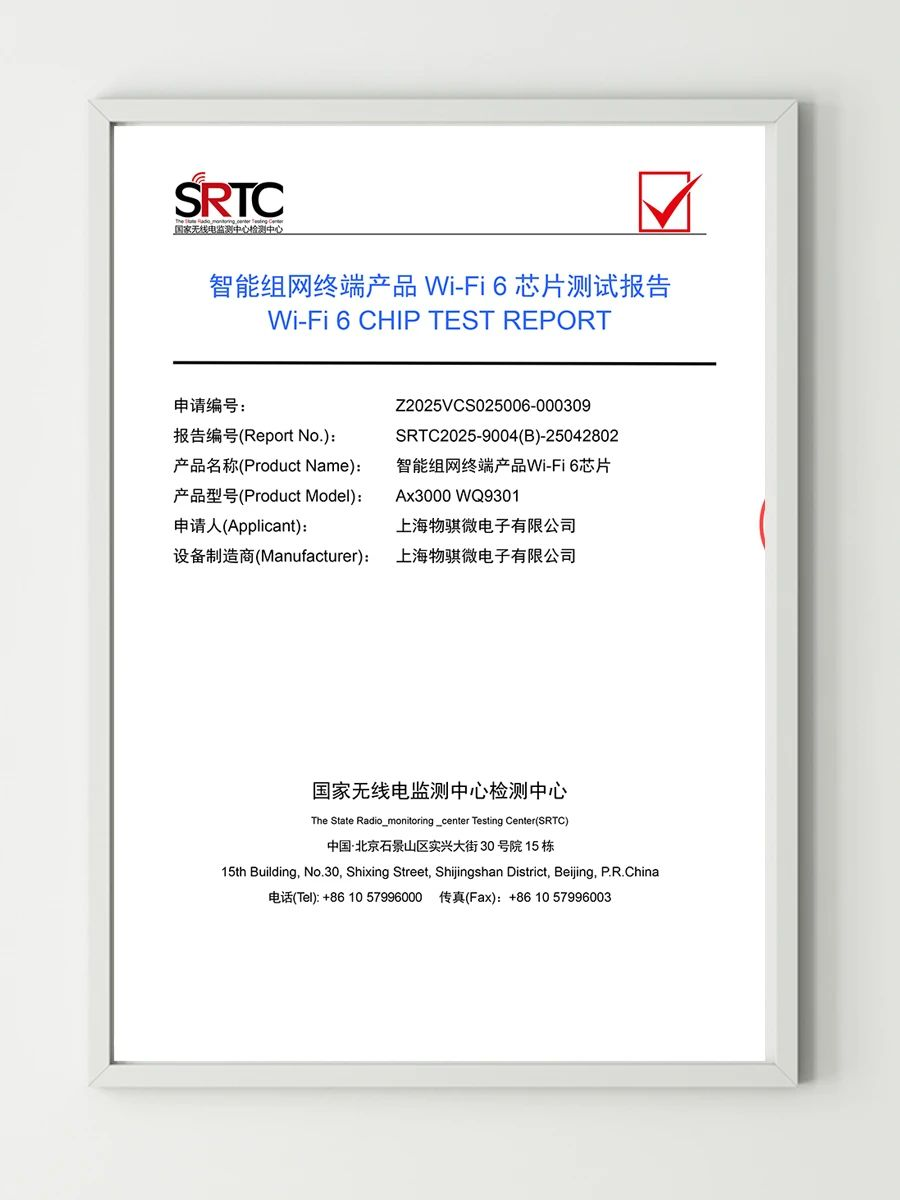 近日,物奇再度迎来重大突破。路由器Wi-Fi芯片WQ9301成功通过国家无线电监测中心检测中心和中移杭州数字家庭实验室的连续性测试,通过对芯片的 Wi-Fi性能、射频性能、基本功能、兼容性、安全性等测试情况进行全面评估,其产品质量和性能符合国家标准和产品导入要求,并获颁产品认证证书。此次测试认证通过为后续导入中国移动供应链体系及规模化商用奠定坚实基础。