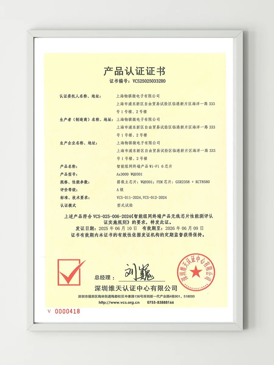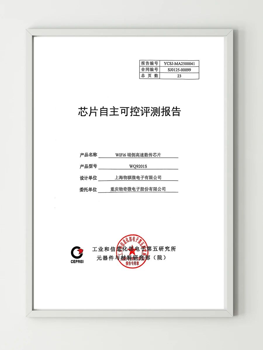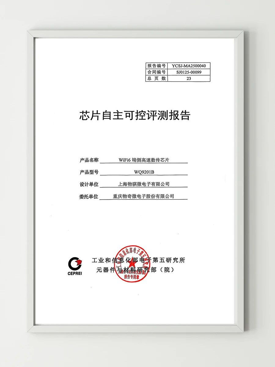 “广五所”作为国家级权威检测机构,其自主可控的认证评测代表产品在技术自主性、供应链安全性等方面符合国家战略标准。这标志着物奇WQ9201系列芯片实现了核心技术和供应链完全自主可控,符合运营商等关键领域客户对芯片自主可控和安全可靠的国产化方案的要求。