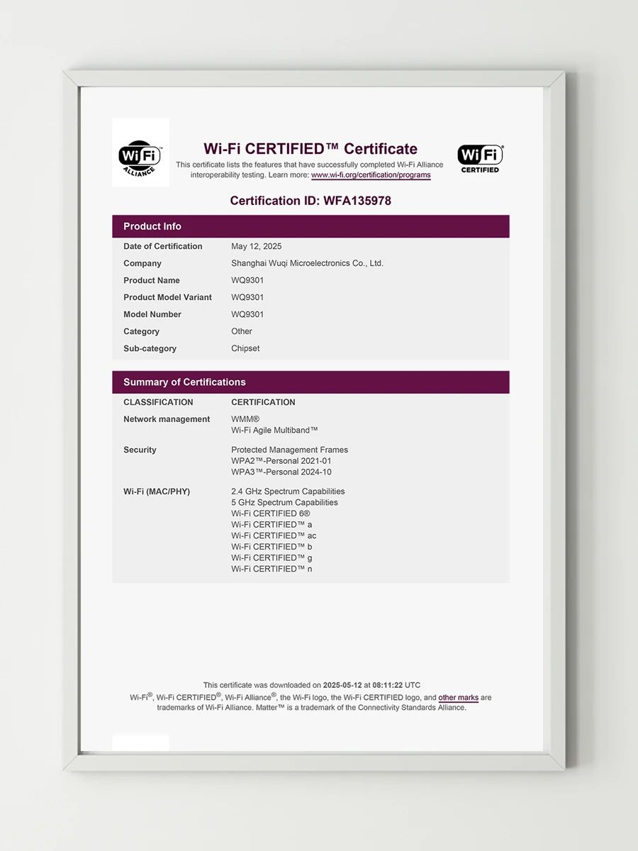 该芯片已通过Wi-Fi联盟国际权威认证,让物奇成为WiFi AP芯片领域国内最早通过该认证标准的创业公司。Wi-Fi联盟是全球最具权威性的无线局域网标准认证机构,其推出的认证体系是衡量Wi-Fi产品兼容性、性能和安全性的重要标准。这意味着物奇的首颗路由器Wi-Fi芯片WQ9301在互操作性、安全性和一系列应用专有协议方面达到了国际公认的产品认证标准。