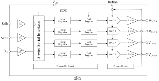 双缓冲逻辑:通过LDAC位控制寄存器更新,实现四路输出同步刷新,避免时序偏差。
