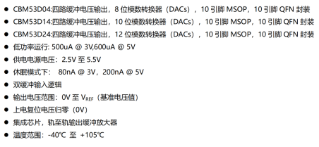 在工业自动化与便携式电子设备高速发展的今天,多通道数模转换器(DAC)面临着“高精度、低功耗、宽温适应性”的三重技术挑战。芯佰微电子推出的CBM53D04/CBM53D14/CBM53D24系列四路缓冲电压输出DAC,以8/10/12位全梯度分辨率覆盖、500μA低功耗架构及-40℃~105℃工业级宽温设计,成为打破海外垄断的国产化标杆。该系列产品通过双缓冲同步控制逻辑与SPI、QSPI、MICROWIRE、DSP兼容接口,不仅解决了传统DAC在多通道同步更新中的时序偏差问题,更以轨至轨输出特性与休眠模式80nA超低功耗,为医疗影像、工业控制、便携仪器等场景提供了“高性能与低能耗并存”的系统性解决方案。
