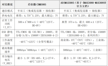 芯佰微 CBM3085 与 ADI MAX3085 核心参数对比
