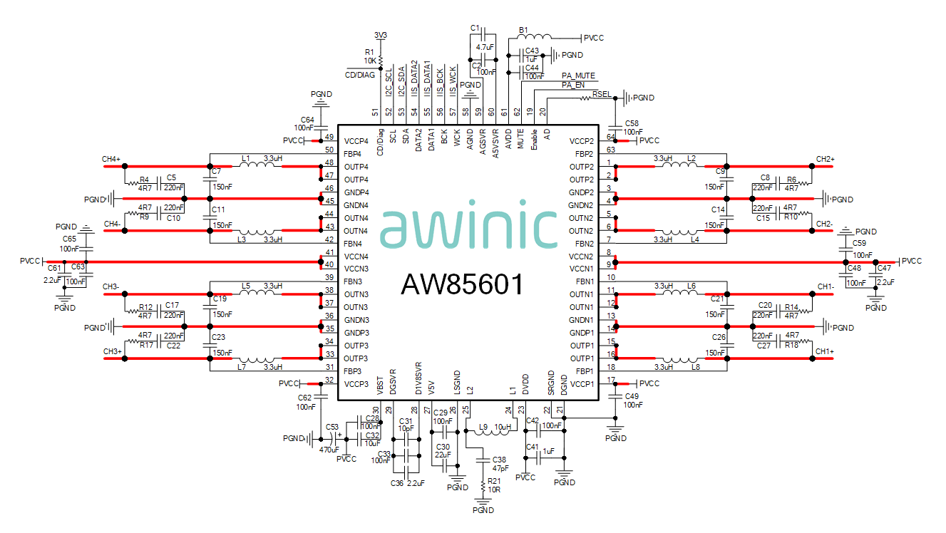 80W,2.1 MHz Digital Input 4 channel Automotive Class D Audio Amplifier with advanced diagnostics and low latency path
