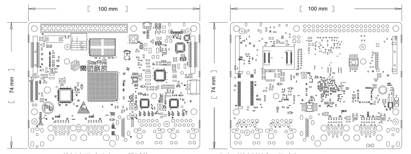 100mm x 74mm 的板卡尺寸略小于飞腾派的 119mm x 93.1mm,作为对比树莓派4B尺寸为85mm x 56mm