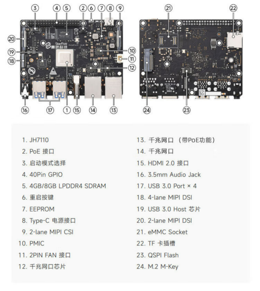 它搭载了昉·惊鸿-7110(JH-7110)RISC-V多媒体处理器,采用64位四核RISC-V CPU,工作频率高达1.5GHz。VisionFive 2不仅性能强劲,而且接口丰富、可扩展性强,软件资源丰富,为开发者提供了一个高效、易用、安全的数据存储和管理平台。以下是关于StarFive VisionFive 2的详细介绍: