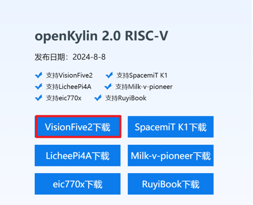 openKylin镜像:https://mirrors.hust.edu.cn/openkylin-cdimage/2.0/openKylin-Embedded-V2.0-Release-visionfive2-riscv64.img.xz