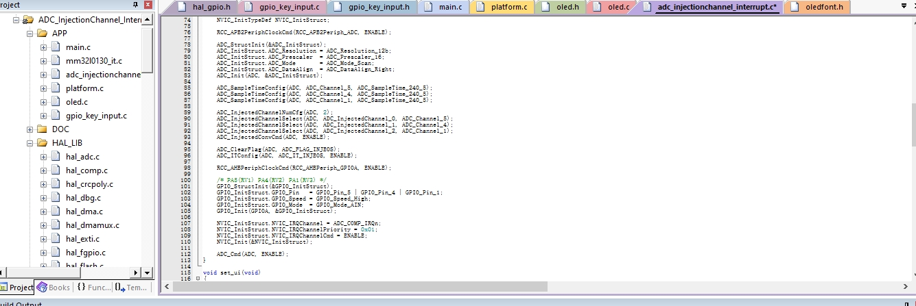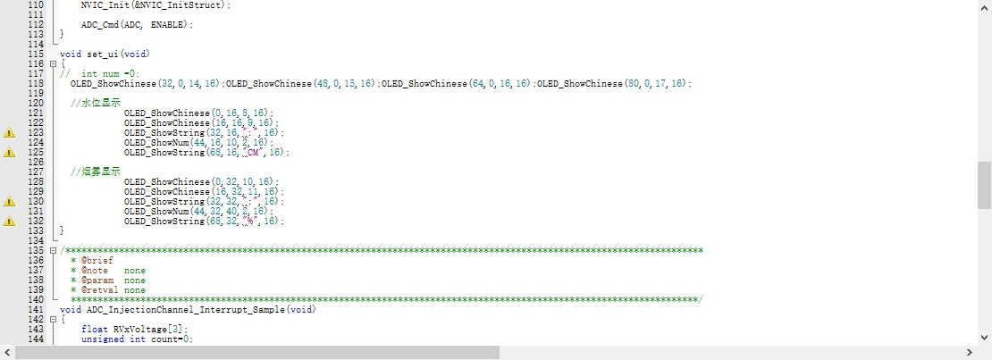 1)、采用板卡的ADC1通道三通道进行水位、烟雾、光照的数据采集转换