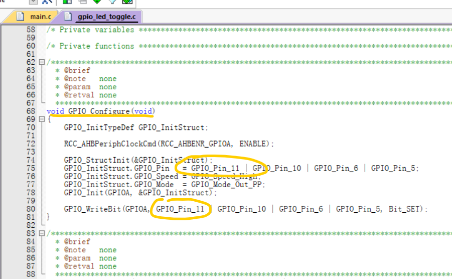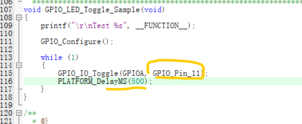 灯是gpioApin11,修改gpio_led_toggle.文件里的 GPIO configure和GPIO_LED_Toggle_Sample函数的引脚即可,延时可改可不改
