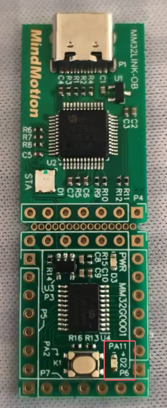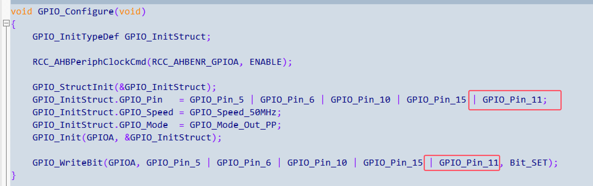 }观察板子,发现板子上LED是PA11,而例程里没有,就需要我们自己添上