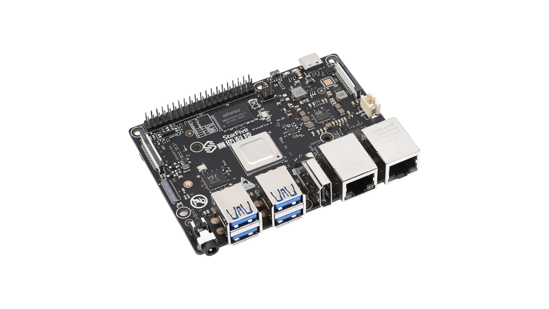 它搭载了昉·惊鸿-7110(JH-7110)RISC-V多媒体处理器,采用64位四核RISC-V CPU,工作频率高达1.5GHz。VisionFive 2不仅性能强劲,而且接口丰富、可扩展性强,软件资源丰富,为开发者提供了一个高效、易用、安全的数据存储和管理平台。以下是关于StarFive VisionFive 2的详细介绍: